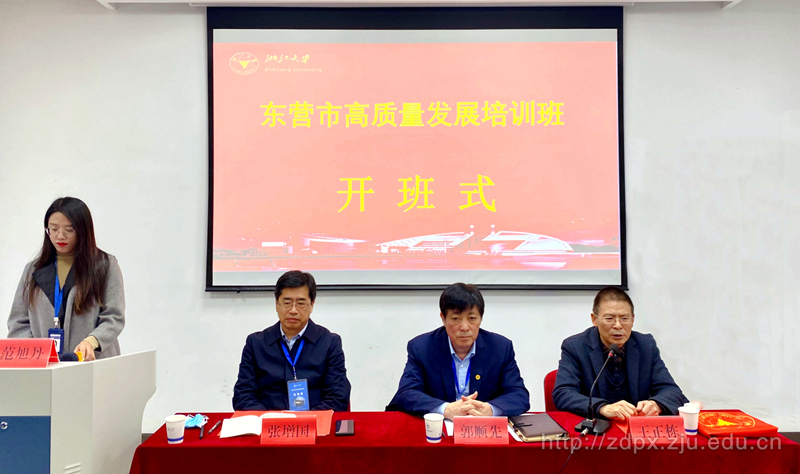 为了贯彻新发展理念,持续推动东营市各项工作高质量发展,12月1日上午,东营市高质量发展培训班在浙江大学华家池校区顺利开班。东营市发展和改革委员会主任郭顺先,东营市委组织部副部长、市委老干部局局长张增国,浙江大学继续教育学院副院长王正栋出席开班式。